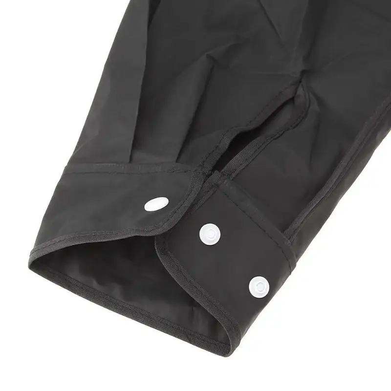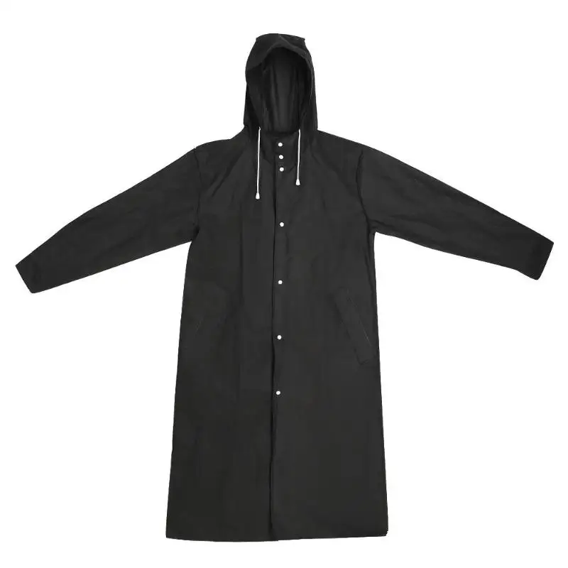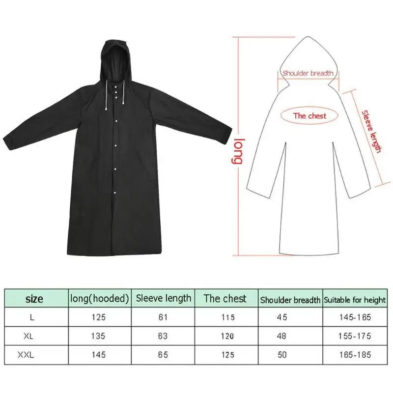 Features: Simple design,cardigan button open way,easy to wear on off. EVA material,breathable,soft and comfortable,good waterproof performance. Adjustable cuff and heighten neck,Multiple waterproof protection,more effective to prevent rain. Specifications: Surface Material: EVA Color: Black Applicable population: Adult,Women/Men Size: L: With Cap Length 125cm/49.21″ Sleeve 61cm/24.02″ Bust 115cm/45.28″ Shoulder 45cm/17.72″ Suitable height 145-165cm/57.09-64.96″ XL: With Cap Length 135cm/53.15″ Sleeve 63cm/24.8″ Bust 120cm/47.24″ Shoulder 48cm/18.9″ Suitable height 155-175cm/61.02-68.9″ XXL: With Cap Length 145cm/57.09″ Sleeve 65cm/25.59″ Bust 125cm/49.21″ Shoulder 50cm/19.69″ Suitable height 165-185cm/64.96-72.83″ Notes: 1. Due to the different monitor and light effect, the actual color of the item might be slightly different from the color showed on the pictures. Thank you! 2. Please allow 1-3mm measuring deviation due to manual measurement.